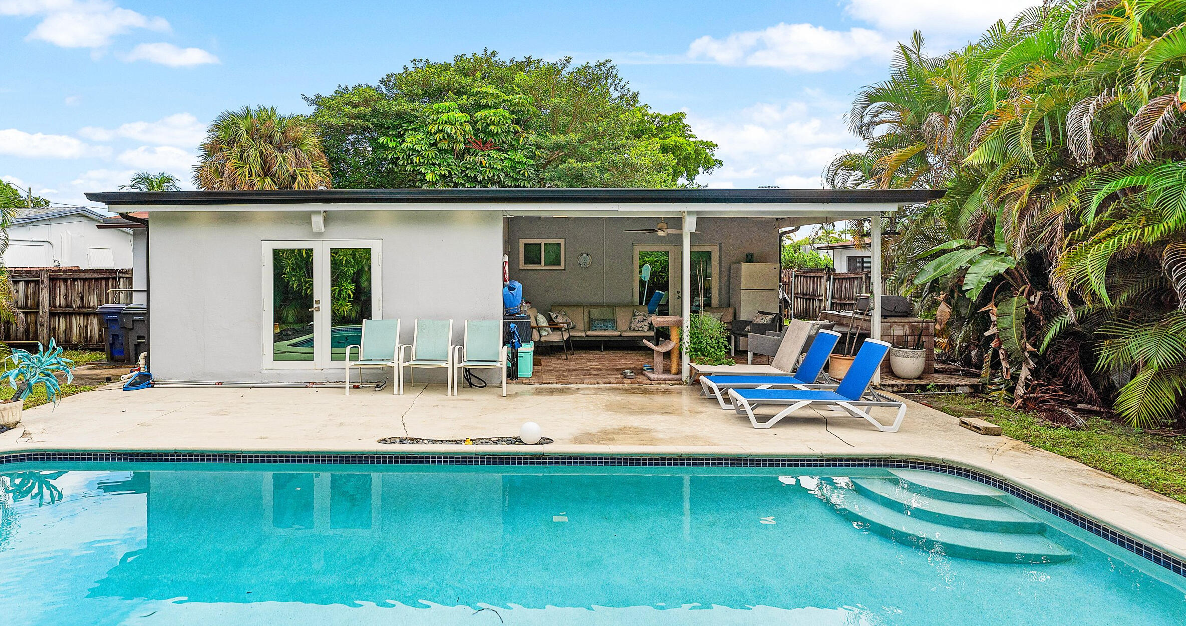 Updated kitchen with stainless, Island, ample storage, barn door access to large laundry room, French Doors lead out to the pool and porch with pavers and outdoor kitchen with built in grill. A/C smart thermostat ,impact windows, custom frosted doors and levers throughout, vinyl flooring throughout. Motion detector lighting. I
