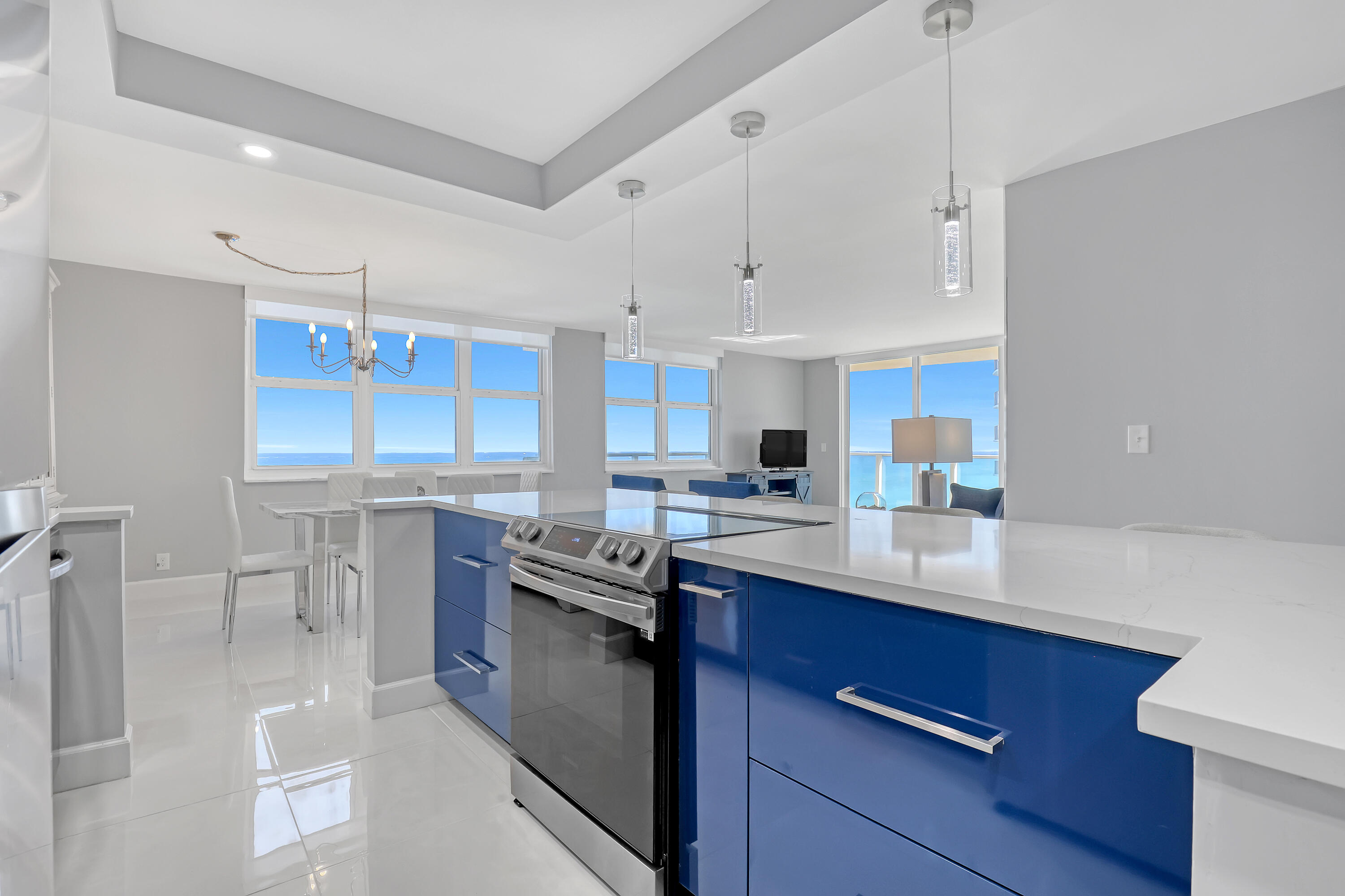 Upon entry, you're immediately greeted with gleaming porcelain tile floors that reflect the shimmering ocean just beyond your windows. The brand new chef's kitchen is an entertainer's dream, featuring a large quartz island, sleek modern cabinetry, stainless steel appliances, and a dedicated coffee bar and wine station. The open concept living and dining area is wrapped in floor to ceiling views and enhanced by motorized shades, creating a refined yet relaxed atmosphere. Both bedrooms feature engineered hardwood flooring. The primary suite offers a custom walk in closet and a spa inspired ensuite with a walk in shower. Step out onto the covered wrap around balcony to take in sweeping views of the ocean, Intracoastal Waterway, and city skylineperfect for morning coffee or sunset cocktails with the sea breeze.